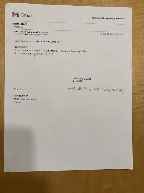I spent a lot of my time at the library going through the correspondence between Truman and his friend from WWI, Eddie McKim. McKim’s son was a Marine and was killed in the Pacific. Eddie McKim and his son will be making an appearance in my performance. The letters are not digitized, so I self digitized most of them. (Example above)