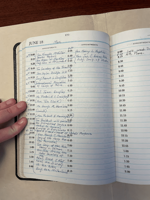 Another item I viewed was Harry’s appointment book. The above photo shows June 18 1945, the day on which an important meeting about the Atomic Bomb occured. Apparently Harry also presented “The distinguished service medal” to General Esienhower on that day. Harry was a busy guy.