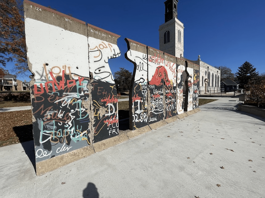 Apparently Churchill’s granddaughter went to Berlin and picked out which pieces of the wall she wanted. She also made the cutouts of people.