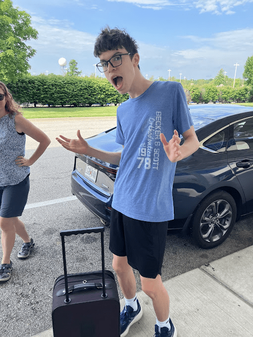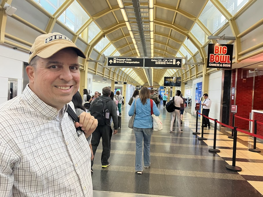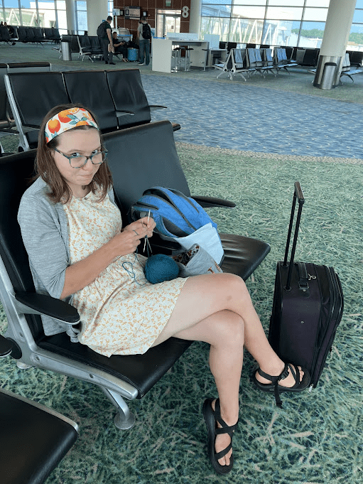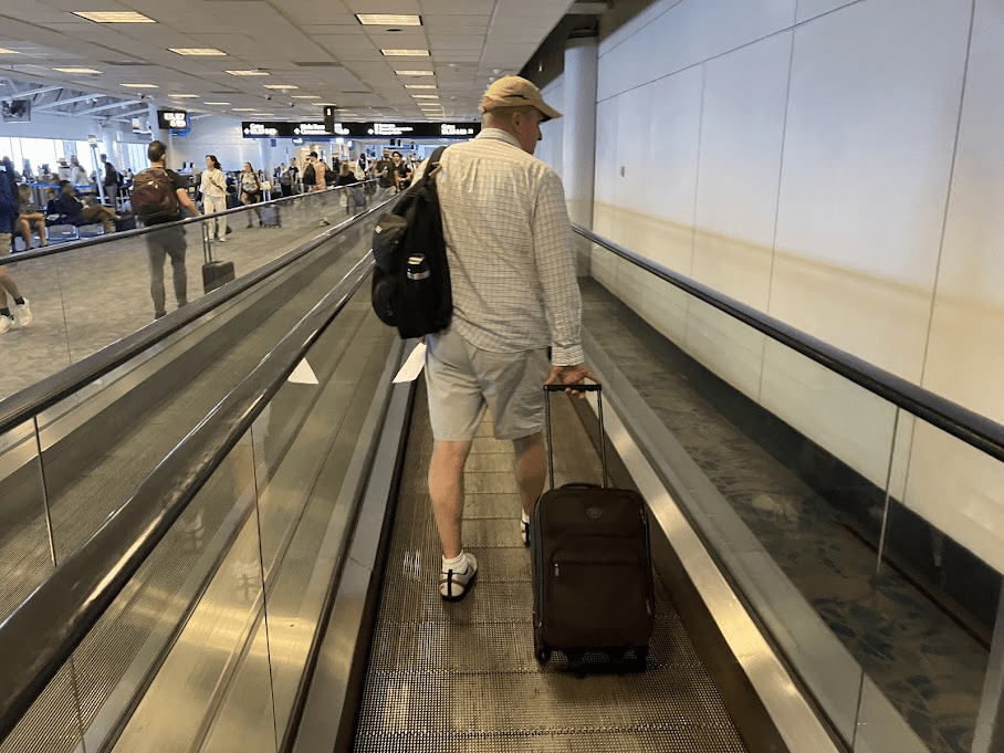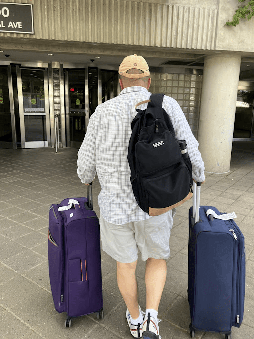We brought three suitcases, in order to have room for our clothes as well as all the stuff for the performance. The small purple suitcase contained my costume, hat, helmet, and paperwork (in a hardshell clipboard). The large purple suitcase contained the deconstructed coat rack and music stand and the flip book, as well as my personal clothes, toiletries, and several books. Even with all this, I ended up with empty space in the suitcase. The blue suitcase contained all my father’s personal items, this suitcase was quite full since he brought his c-pap machine, and pillow.