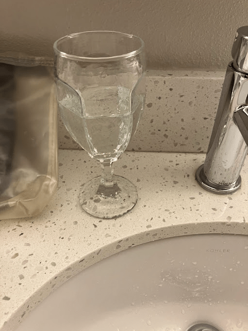 Among the dishes in our room were a few wine glasses, one of which I chose to use as a rinse and spit cup.