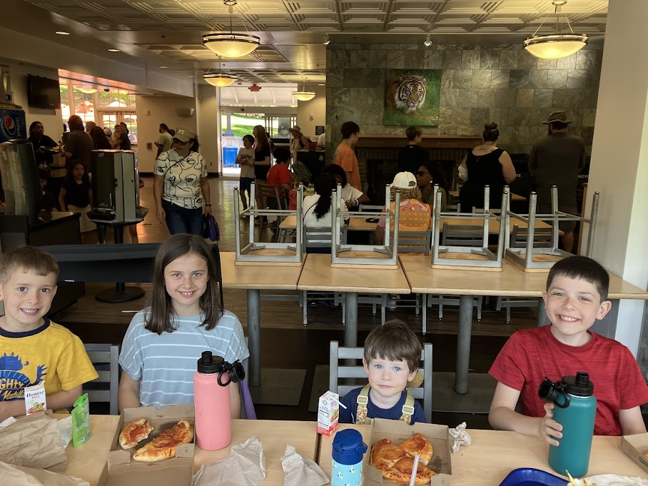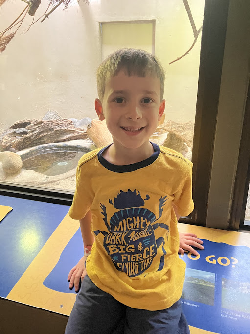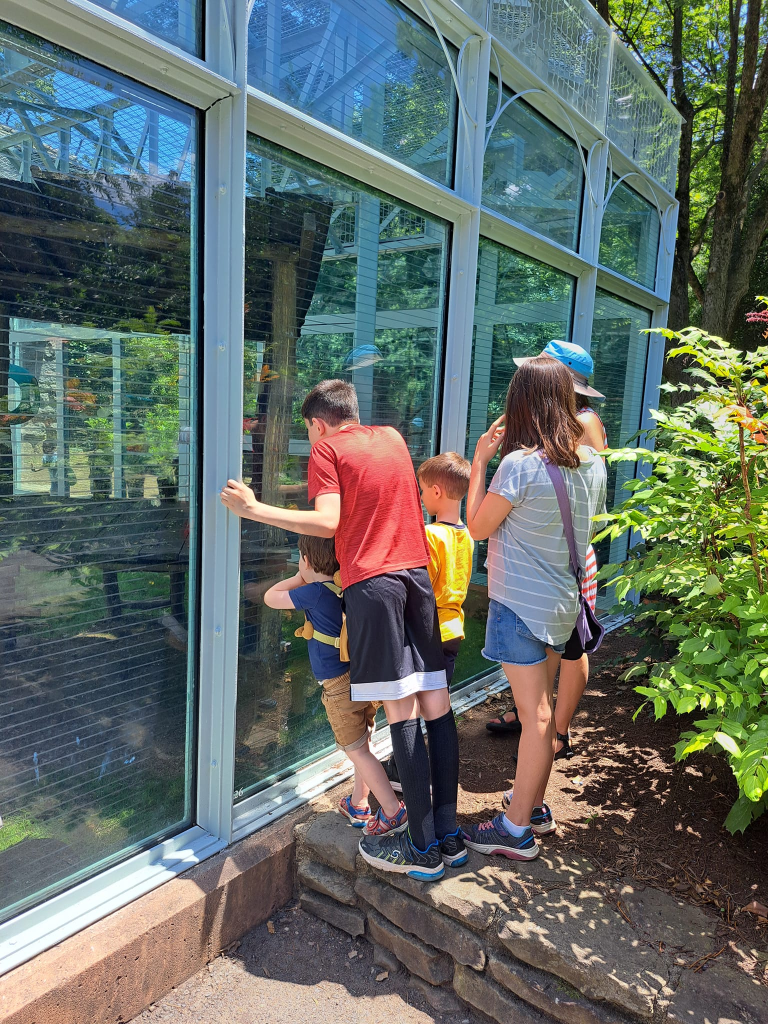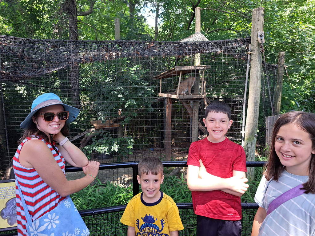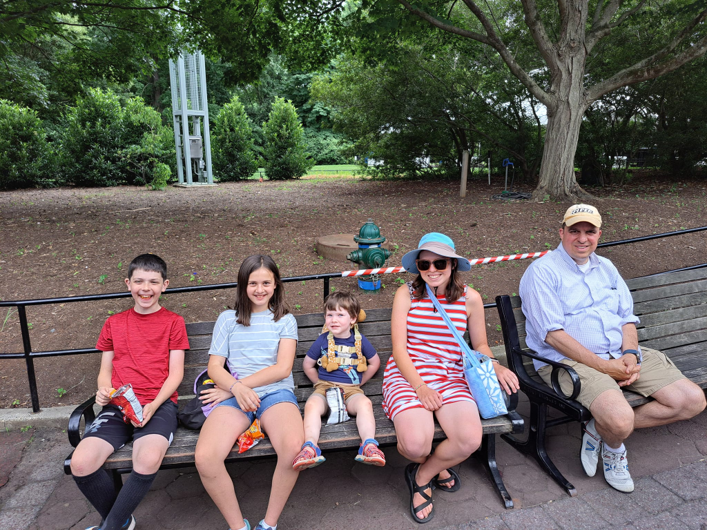 Taking a break after the reptile house. Isaac is not in the photo because he was sitting on a frog statue off to the side. (Photo credit: Dave McKinstry)