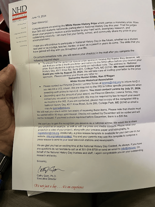 After sitting and listening to winners be called for what felt like forever, I was surprised to hear my name announced for the White House History prize! I learned that after my regular judging, a video of my performance went to a whole separate panel of White House judges. A guy from the White House came to give me my medal. I felt like a celebrity for about five minutes.