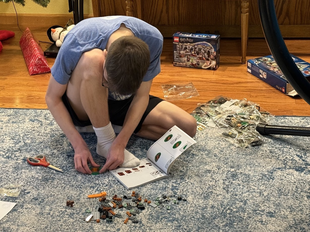 Luke worked on putting together his new Lego sets.